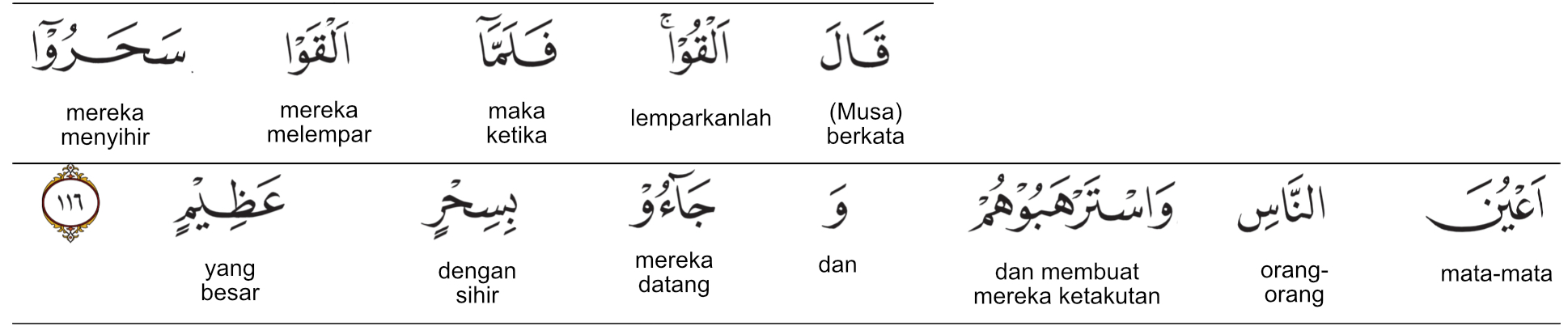 Prof. Quraish Shihab : Dia (Nabi Musa as.) menjawab: “Lemparkanlah (terlebih dahulu apa yang hendak kamu lempar)!” Maka, ketika mereka melemparkan (tali temali itu), mereka menyihir mata orang banyak (tali temali terlihat bagaikan ular-ular yang bergerak dan bertumpuk satu sama lain) dan menjadikan mereka sangat takut, dan mereka (para penyihir itu) mendatangkan sihir yang sangat besar.