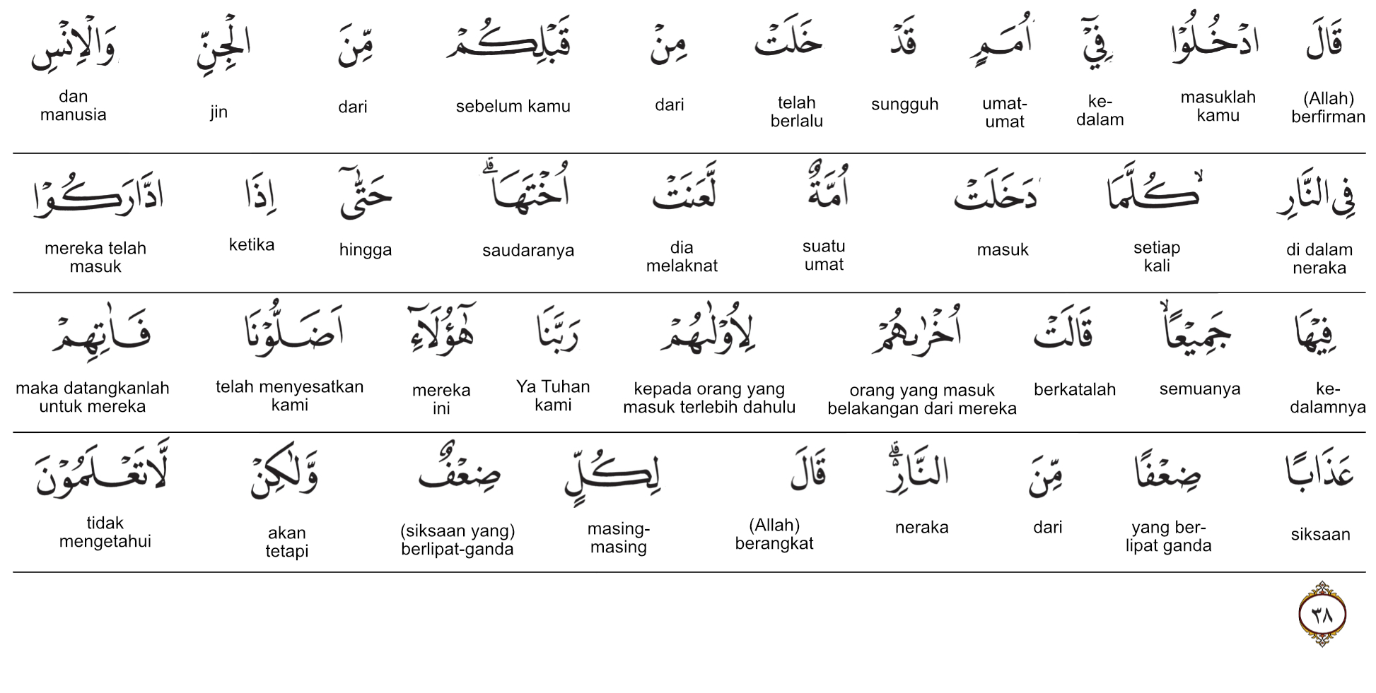 Prof. Quraish Shihab : Dia berfirman: “Masuklah kamu bersama umat-umat yang sungguh telah berlalu sebelum kamu dari (golongan) jin dan manusia ke dalam neraka.” Setiap suatu umat masuk, dia mengutuk saudaranya sehingga apabila mereka semua telah masuk, berkatalah orang-orang yang masuk kemudian (para pengikut) di antara mereka kepada orang-orang yang masuk terdahulu (para pemimpin): “Tuhan Pemelihara kami, mereka telah menyesatkan kami, sebab itu berikanlah kepada mereka azab berlipat ganda dari neraka.” Dia berfirman: “Masing-masing mendapat (azab) berlipat ganda, tetapi kamu tidak mengetahui.”