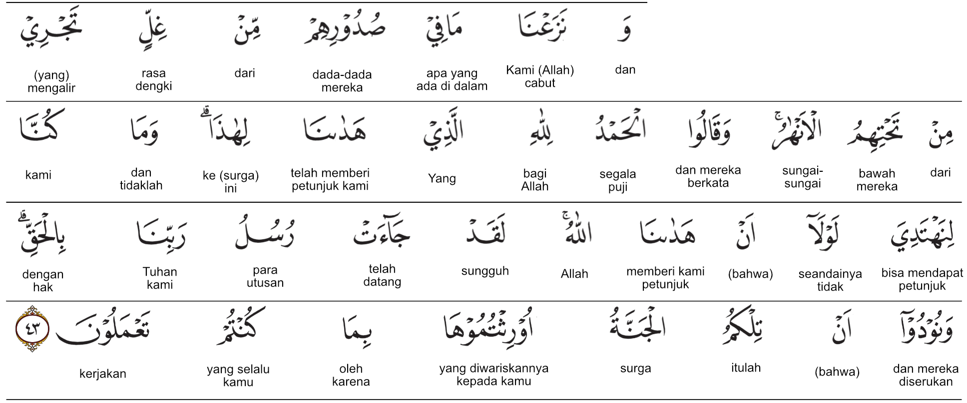 Prof. Quraish Shihab : Dan Kami telah mencabut apa yang berada dalam dada-dada mereka dari semua kedengkian; (di surga sana, di mana mereka berada di tempat yang tinggi yang) di bawah mereka mengalir sungai-sungai, dan mereka berkata: “Segala puji hanya bagi Allah yang telah menunjuki kami (memberi kami bimbingan dan kemampuan untuk beramal sehingga mengantar kami) ke sini (surga ini), sedangkan kami sekali-kali tidak akan mendapat petunjuk jika seandainya Allah tidak memberi kami petunjuk. Demi (Allah)! Sungguh, telah datang para rasul Tuhan Pemelihara kami dengan haq (benar dan membawa kebenaran).” Dan diserukan kepada mereka: “Itulah surga yang diwariskan kepada kamu, disebabkan apa (amal-amal saleh) yang dahulu kamu kerjakan.”