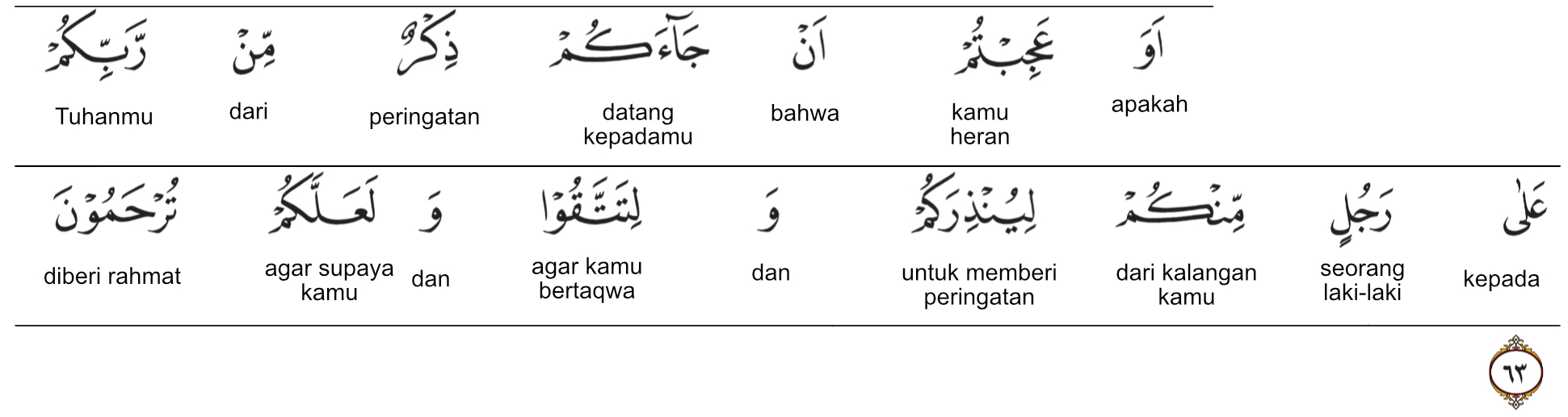 Kemenag RI 2019 : Apakah kamu (tidak percaya dan) heran bahwa telah datang kepada kamu peringatan dari Tuhanmu kepada seorang laki-laki dari golonganmu agar dia memberi peringatan kepadamu, agar kamu bertakwa, dan agar kamu mendapat rahmat?”
