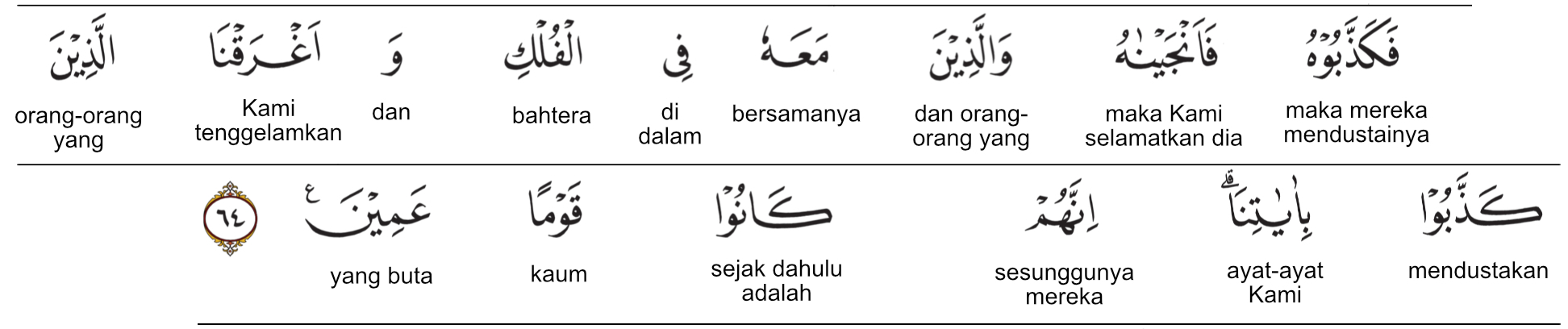 Prof. HAMKA : Tetapi mereka dustakan dia. Maka, Kami selamatkanlah dia dan orang-orang yang besertanya dalam sebuah bahtera. Kami tenggelamkan orang-orang yang telah mendustakan ayat-ayat Kami itu. Sesungguhnya mereka adalah kaum yang buta.