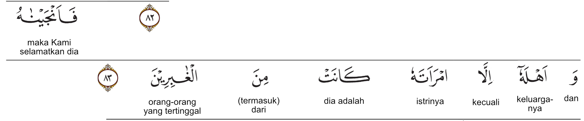 Kemenag RI 2019 : Maka, Kami selamatkan dia dan pengikutnya, kecuali istrinya. Dia (istrinya) termasuk (orang-orang kafir) yang tertinggal.