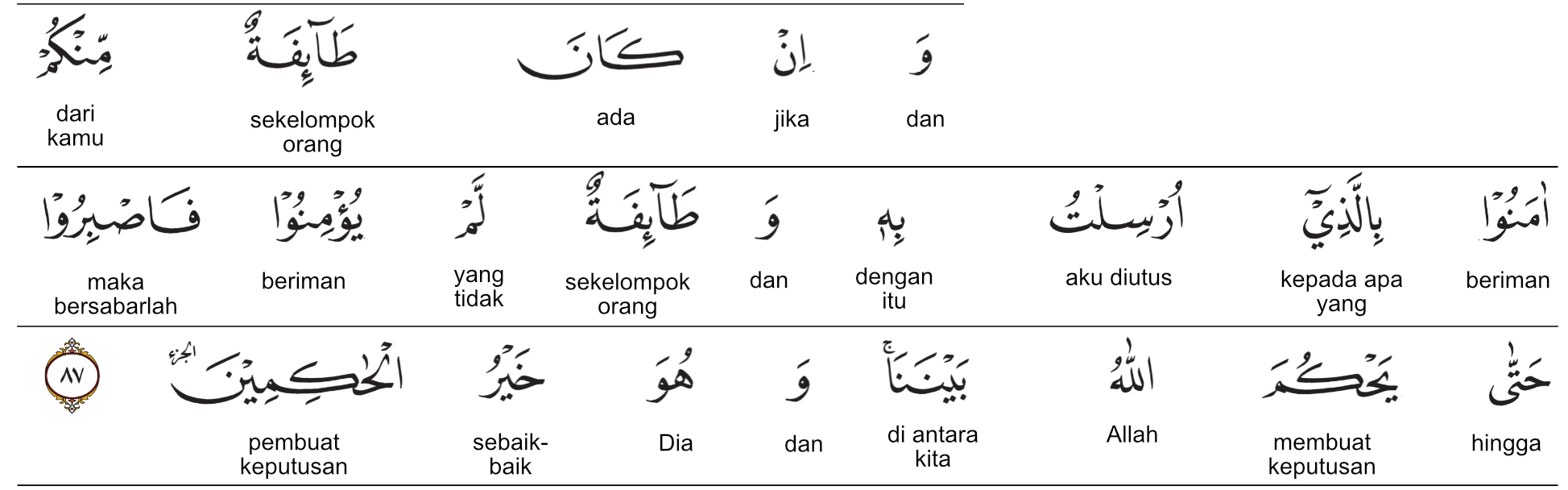 Prof. Quraish Shihab : Dan jika ada segolongan dari kamu beriman kepada apa yang aku diutus untuk menyampaikannya dan ada (pula) segolongan yang tidak beriman, maka bersabarlah hingga Allah memutuskan (perkara) diantara kita dan Dia adalah sebaik-baik Pemberi putusan.