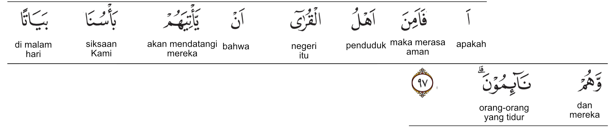 Prof. HAMKA : Maka merasa amankah penduduk negeri-negeri itu bahwa datang kepada mereka siksaan Kami di waktu malam padahal mereka sedang tidur.