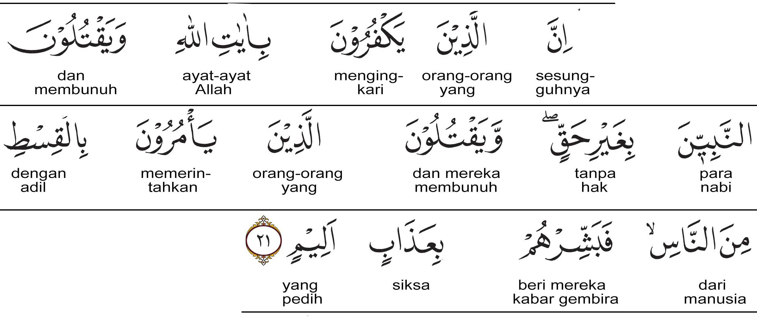 Sesungguhnya, orang-orang yang kufur pada perintah-perintah Allah dan membunuh nabi-nabi dengan tidak benar dan membunuh orang-orang yang menyuruhkan keadilan kepada manusia maka beri ancamanlah mereka dengan siksa yang pedih.