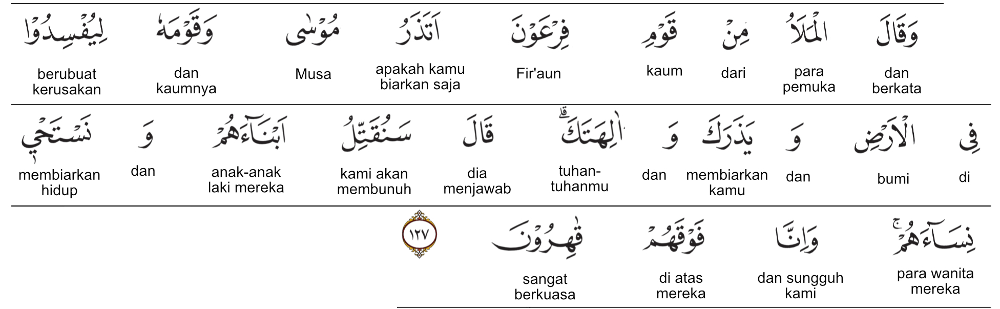 Kemenag RI 2019:Para pemuka dari kaum Fir‘aun berkata, “Apakah engkau akan membiarkan Musa dan kaumnya sehingga mereka berbuat kerusakan di negeri ini (Mesir) dan dia (Musa) meninggalkanmu dan tuhan-tuhanmu?” (Fir‘aun) menjawab, “Akan kita bunuh anak-anak laki-laki mereka dan kita biarkan hidup anak-anak perempuan mereka. Sesungguhnya kita berkuasa penuh atas mereka.” Prof. Quraish Shihab:Dan berkatalah para pemuka dari kaum Firaun: “Apakah engkau akan membiarkan Musa dan kaumnya sehingga akibatnya mereka membuat kerusakan di bumi dan meninggalkanmu kamu serta sesembahan-sesembahanmu?” Dia (Firaun) menjawab: “Akan kita bunuh anak-anak laki-laki mereka dan kita biarkan hidup (anak-anak) perempuan mereka (untuk disiksa dan dilecehkan) dan sesungguhnya kita berkuasa penuh atas mereka.” Prof. HAMKA:Dan, berkata pemuka-pemuka dari kaum Fir’aun itu, “Apakah akan engkau biarkan Musa dan kaumnya membuat kerusakan di bumi dan dia tinggalkan engkau dan tuhan-tuhan engkau?” Dia berkata, “Akan kita bunuh anak-anak laki-laki mereka dan kita biarkan hidup perempuan-perempuan mereka karena sesungguhnya kita atas mereka adalah sangat berkuasa.”